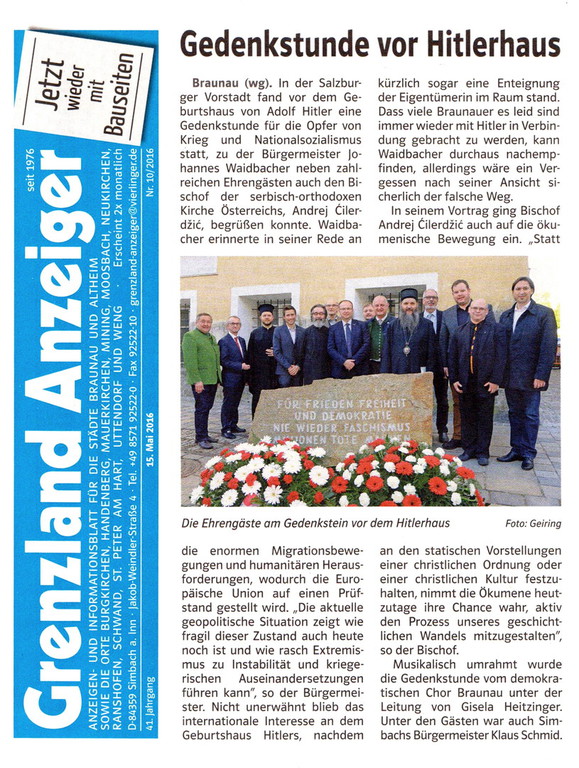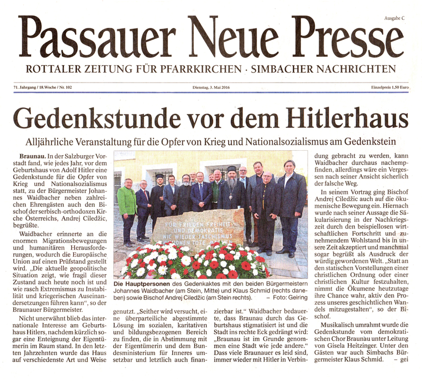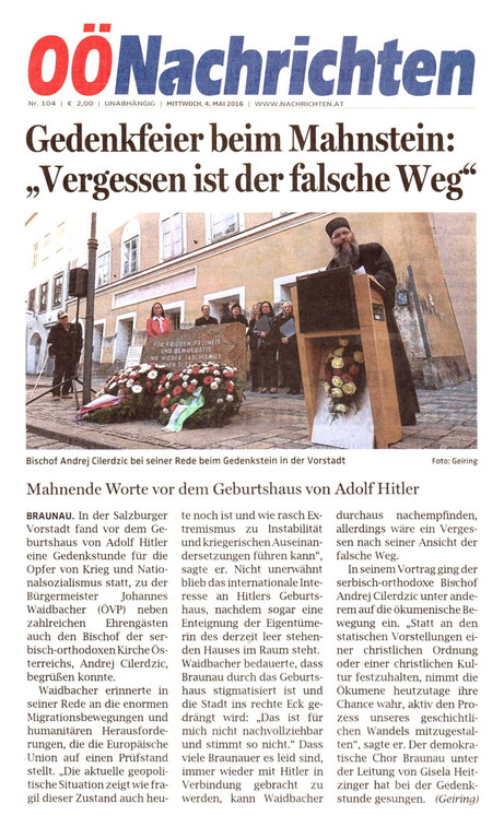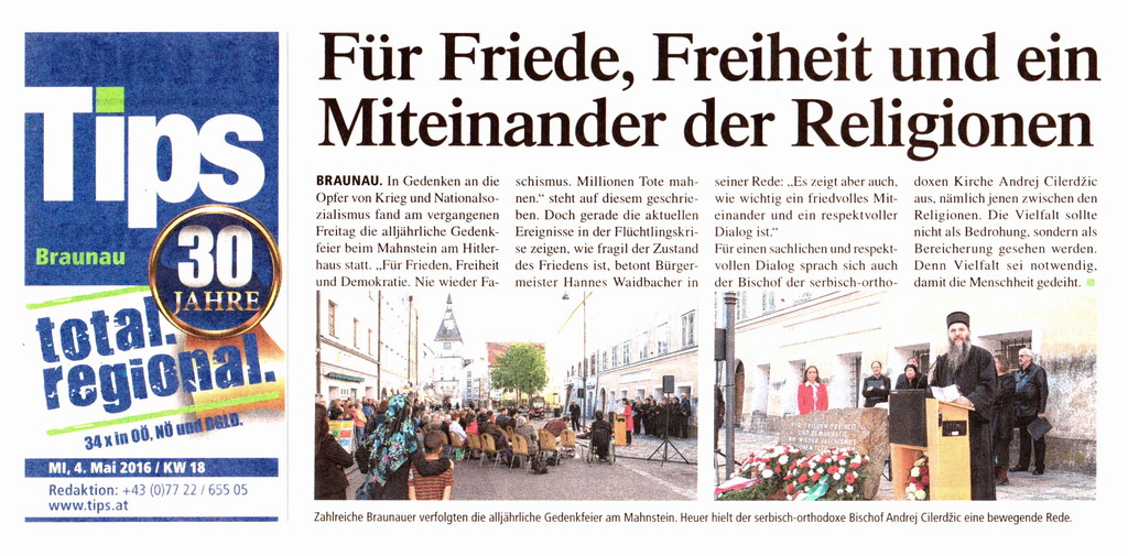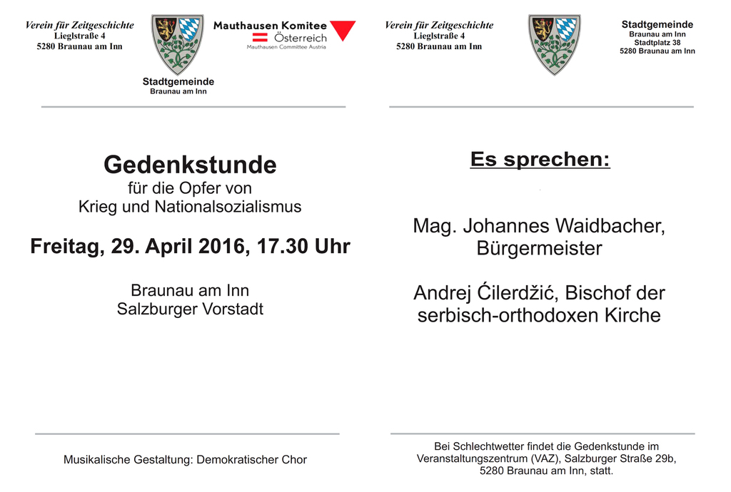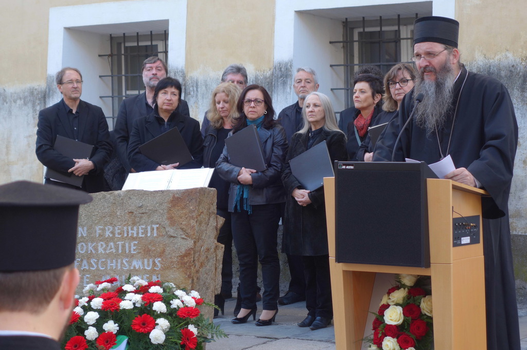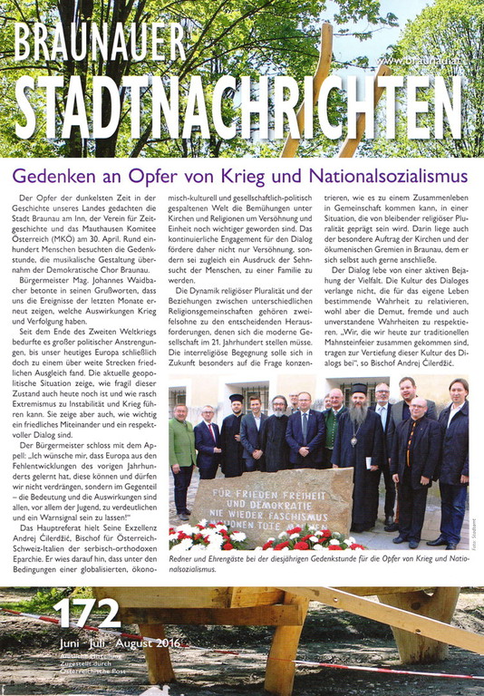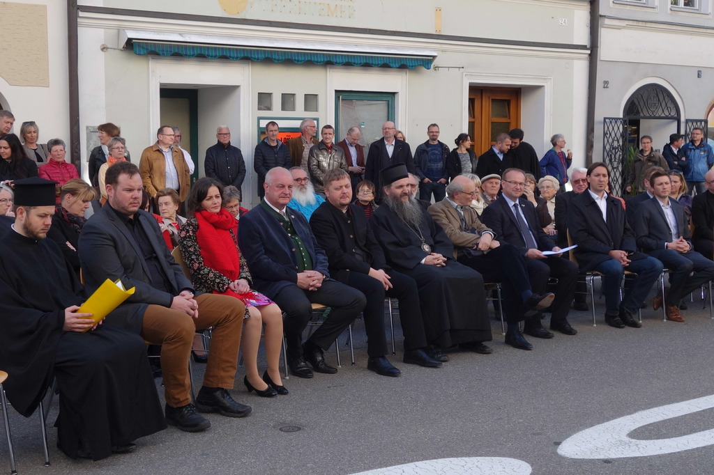 In der Salzburger Vorstadt in Braunau fand wie jedes Jahr eine Gedenkstunde für die Opfer von Krieg und Nationalsozialismus statt, zu der Bürgermeister Mg. Johannes Waidbacher neben zahlreichen Ehrengästen auch den Bischof der serbisch-orthodoxen Kirche Österreichs, Andrej Ćiledžic, begrüßte.