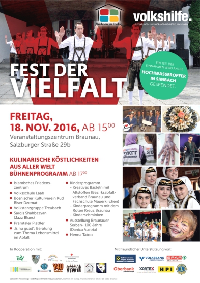 Am Freitag, 18. November 2016, ab 15 Uhr findet im Veranstaltungszentrum Braunau, Salzburger Straße 29a, 5280 Braunau am Inn, das Fest der Vielfalt statt. Ab 17 Uhr gibt es ein Bühnenprogramm.