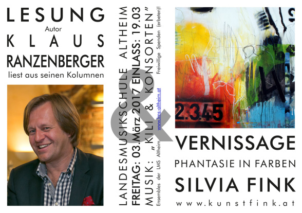Silvia Fink, Gildenmeisterin der Innviertler Künstlergilde - www.kunstfink.at, stellt in der LMS Altheim ihre Phantasie in Farben aus. Dazu gibt es natürlich eine originelle Vernissage mit dem schon allseits bekannten Buchautor Klaus Ranzenberger, der aus seinen Kolumnen liest. Musik gibt’s von Josef Kili…