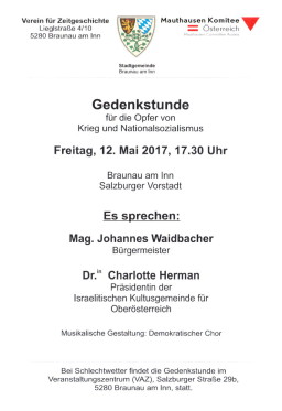 Gedenkstunde für die Opfer von Krieg und Nationalsozialismus am Freitag 12. Mai 2017 um 17.30 Uhr