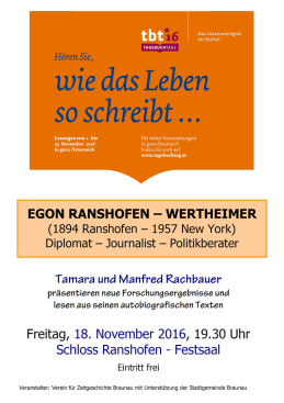 Erstmals wird auch in Braunau eine Veranstaltung als "Tagebuchtag" organisiert und dabei eine Persönlichkeit in den Mittelpunkt gerückt, die weltweit Anerkennung und Respekt gefunden hat: Egon Ranshofen-Wertheimer (1894 - 1957), der in Ranshofen geborene Journalist, Diplomat und Politikberater, einer der frühen Vordenker und Mitgestalter der UNO.