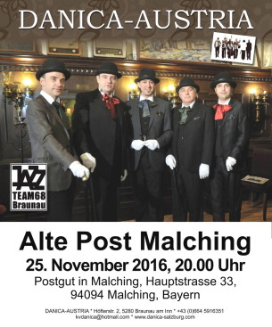 Das TEAM68 freut sich auf den nächsten Jazz-Stammtisch am Freitag, 25. November 2016 um 20.00 Uhr in der Alten Post, Malching, Hauptstrasse 33, 94094 Malching in Bayern, mit dem Musikensemble DANICA-AUSTRIA