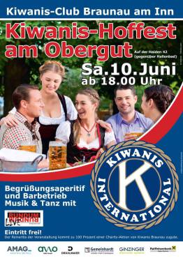 Nach den großartigen Festen in den vergangenen drei Jahren veranstaltet der Kiwanis-Club Braunau am Samstag, dem 10. Juni 2017, gemeinsam mit dem Obergut (Auf der Haiden 42, gegenüber Hallenbad) das „4. Kiwanis-Hoffest am Obergut“ in Braunau. Einlass ist ab 18.00 Uhr.