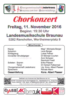 Der Liederkranz Braunau würde sich sehr freuen, Sie beim Konzert am 11. November 2016 begrüßen zu können. Der Chor wird dankenswerter Weise wieder, wie bereits im Vorjahr, von den Sängerinnen des Projektchores Ostermiething unterstützt.