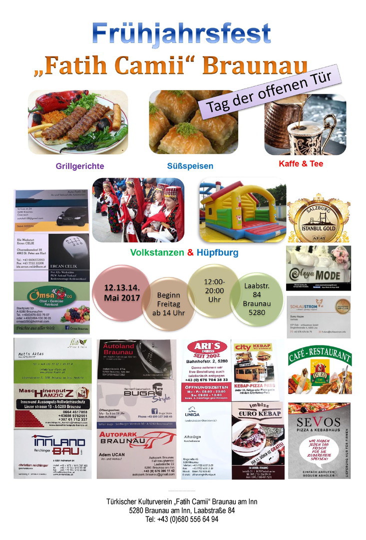 Der Braunauer Kulturverein „Fatih Camii“ lädt zum Frühjahrsfest mit vielfältigem Programm ein. Es werden eine Besichtigung der Moschee, türkische Spezialitäten und Getränke sowie Unterhaltung für Kinder angeboten.