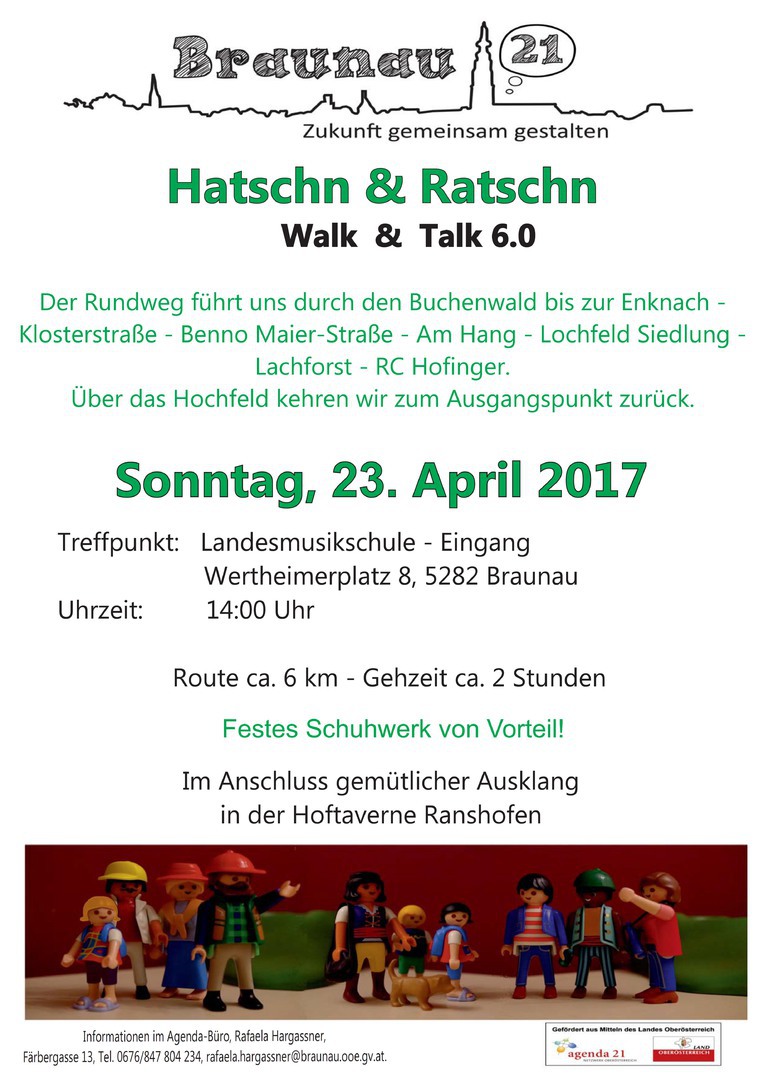 Die Gruppe Walk & Talk organisiert am 23. April 2017 wieder einen Spaziergang der beliebten Reihe Hatschn & Ratschn. Die geselligen Wanderungen bieten den gemütlichen Rahmen dafür, die MitbürgerInnen besser kennenzulernen und gemeinsam unsere Stadt zu erkunden. Weitere Informationen unter: www.braunau21.at/hatschn-ratschn-im-fruehling/