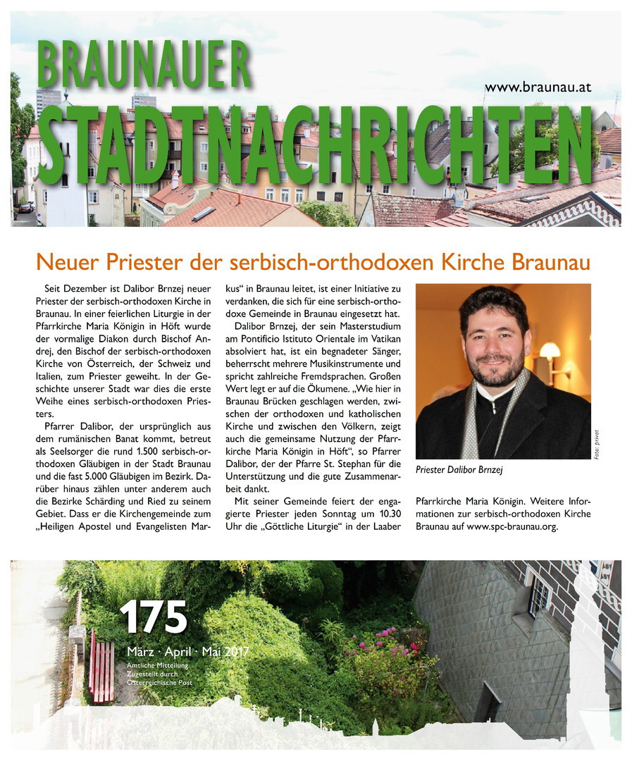Seit Dezember ist Dalibor Brnzej neuer Priester der serbisch-orthodoxen Kirche in Braunau. In einer feierlichen Liturgie in der Pfarrkirche Maria Königin in Höft wurde der vormalige Diakon durch Bischof Andrej, den Bischof der serbisch-orthodoxen Kirche von Österreich, der Schweiz und Italien, zum Priester geweiht. Weitere Informationen>>>