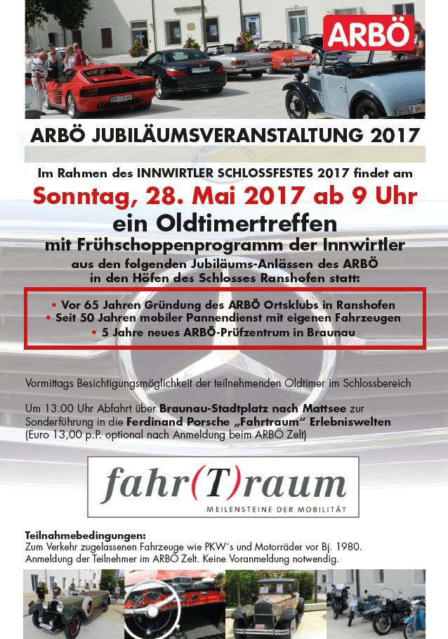 Im Zuge des Oldtimer-Frühschoppen des Ortsklub Braunau-Ranshofen werden am 28. Mai 2017 gleich drei Jubiläen gefeiert. Der Schloßpark in Ranshofen bietet die ideale Lokalität um 50 Jahre ARBÖ Pannendienst, 65 ereignisreiche Jahre Ortsklub Ranshofen und 5 Jahre neue Prüfzentrum Braunau zu würdigen.
