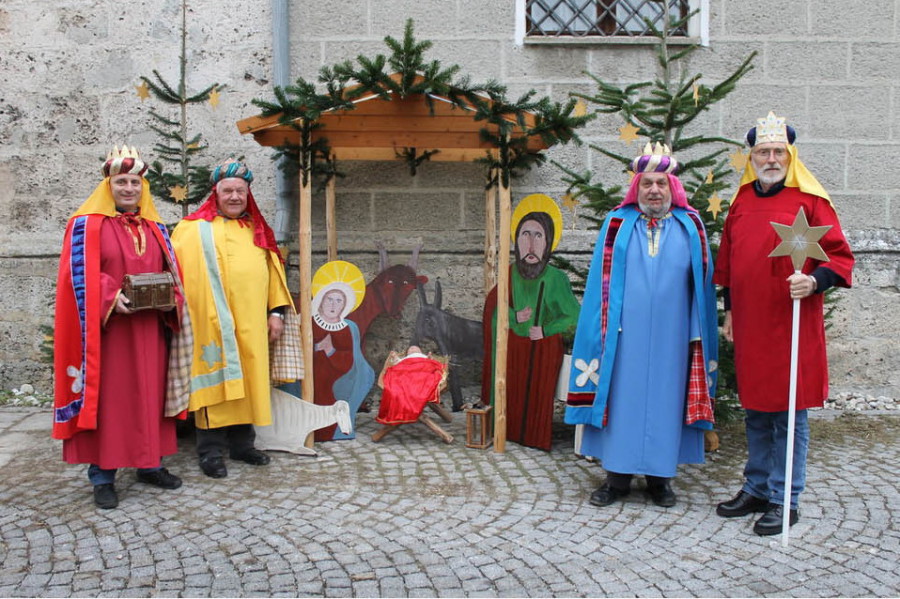 BRAUNAU (penz). "Die heiligen drei König san do" - Helmut Bogner vom gleichnamigen Gasthaus in Haselbach zieht mit seinen zwei Königskumpanen Anton Kraxenberger und Martin Höller, sowie Sternträger Christian Brandner durch die Haselbacher Dorfgemeinschaft. Mit Gold, Weihrauch und Mhyrre ausgestattet singen sie sich am 3. und 4. Jänner von Haushalt zu Haushalt. Der Grund dafür: Die vier setzen sich für die erst kürzlich einsturzgefährdete Haselbacher Kirche ein. Sie möchten Monsignore Stefan Hofer beim Spenden sammeln unter die Arme greifen, denn es stehen noch einige Renovierungsarbeiten aus.