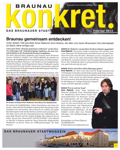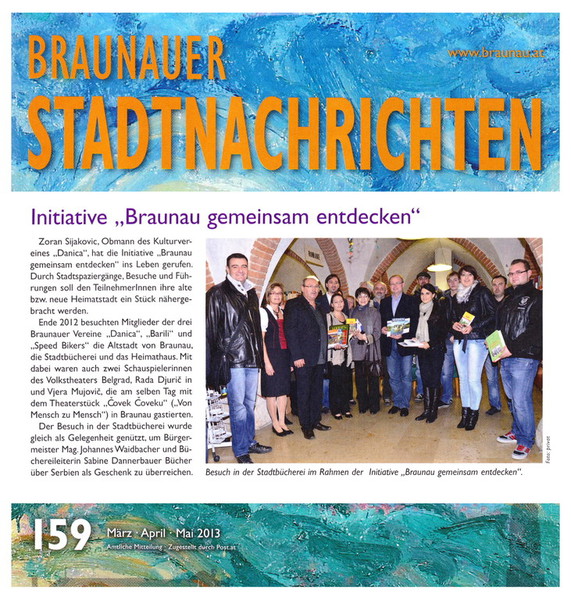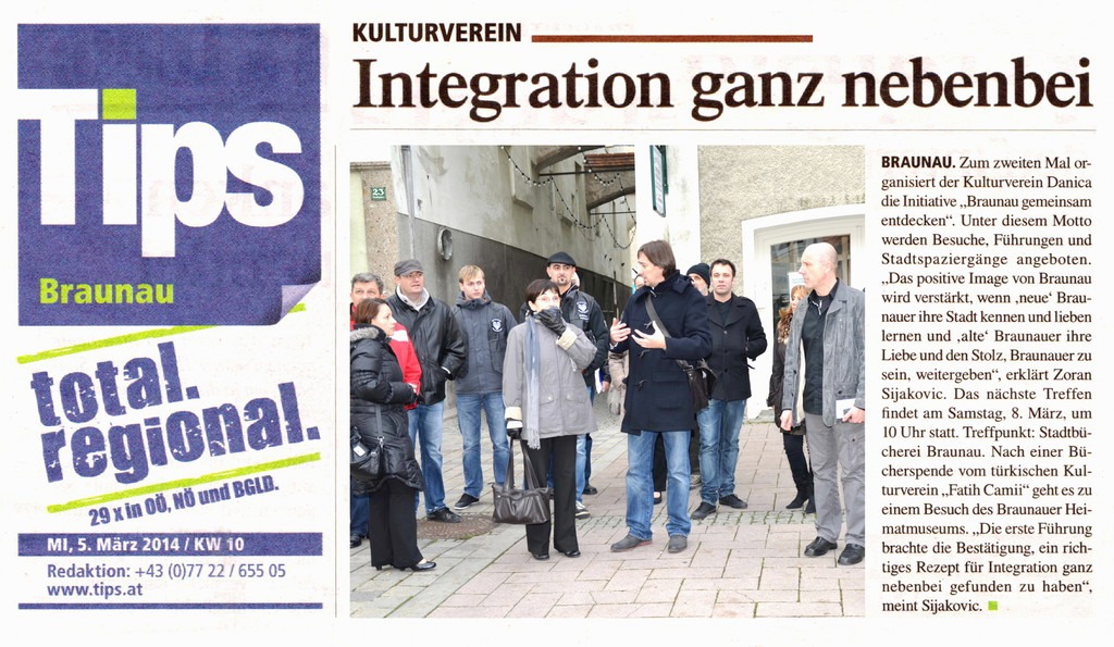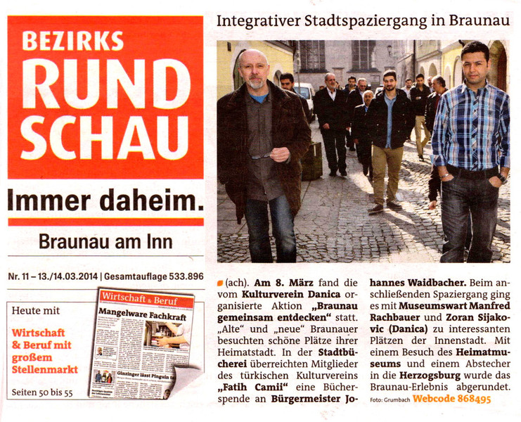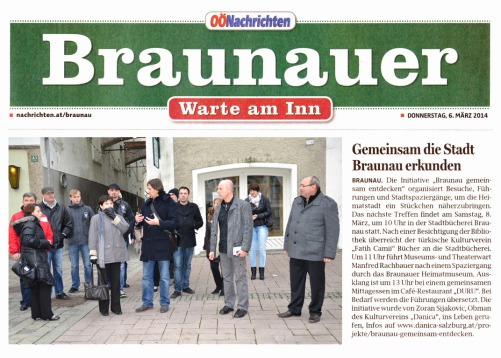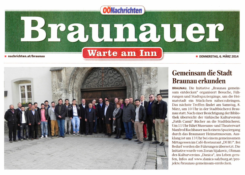 Am 08. März 2014 fand die vom Kulturverein Danica organisierte Aktion „Braunau gemeinsam entdecken“ statt. „Alte“ und „neue“ Braunauer besuchten bei Prachtwetter schöne Plätze ihrer Heimatstadt. Der Beginn war in der Stadtbücherei, wo Mitglieder des türkischen Kulturvereins „Fatih Camii“ eine Bücherspende an Bürgermeister Johannes Waidbacher überreichten. „Für eine gute Zukunft ist es wichtig, dass wir zusammmenkommen und etwas gemeinsam unternehmen, begrüßte Waidbacher die Initiative.