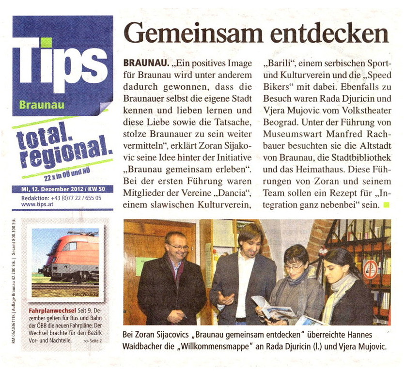 Am 18. November 2012 besuchten Mitglieder und Vertreter der Braunauer Vereine "Barili" und "Danica", die Altstadt von Braunau, die Stadtbibliothek sowie das Heimathaus. Die Führung übernahm der Museums- und Theaterwart der Stadtgemeinde, Manfred Rachbauer.