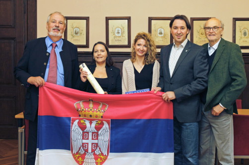 Botschaftssekretärin Maša Grimm überreicht zwei serbische Bannerfahnen